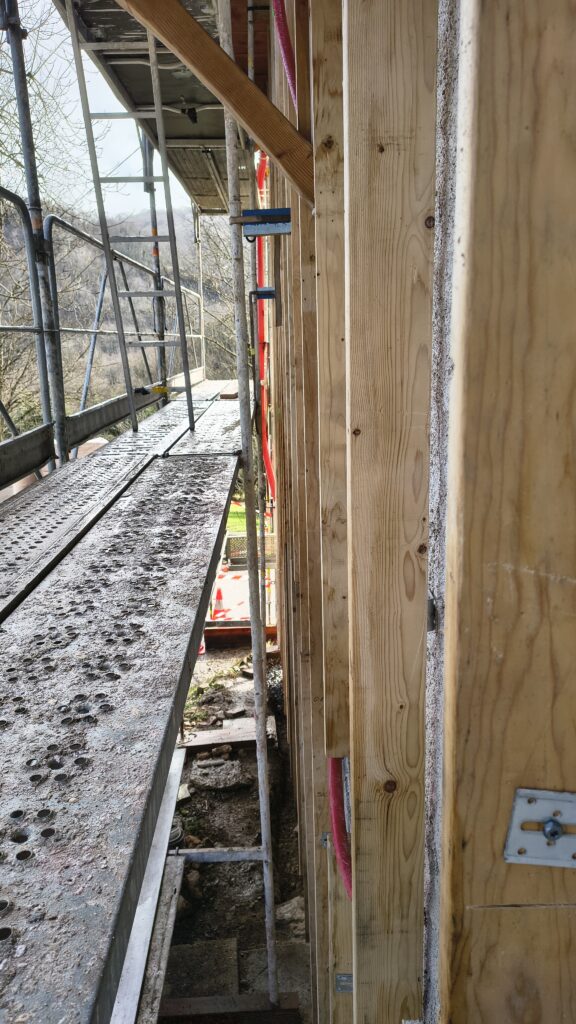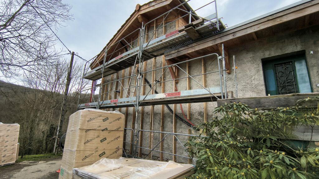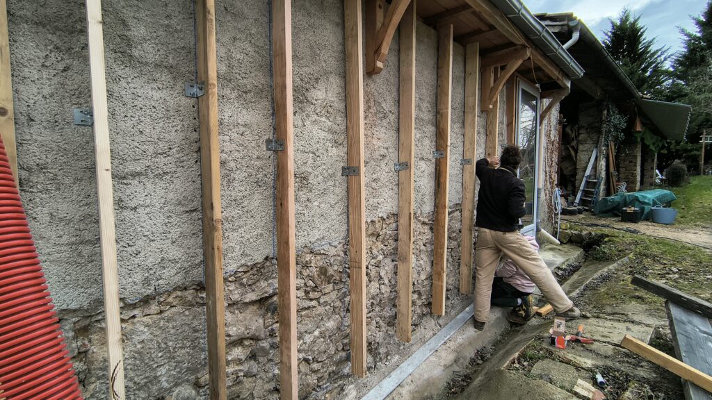 Réalisation de l’ossature bois en bois de réemploi fixée sur maison ancienne pour une ITE (Isolation Thermique par l’extérieur)